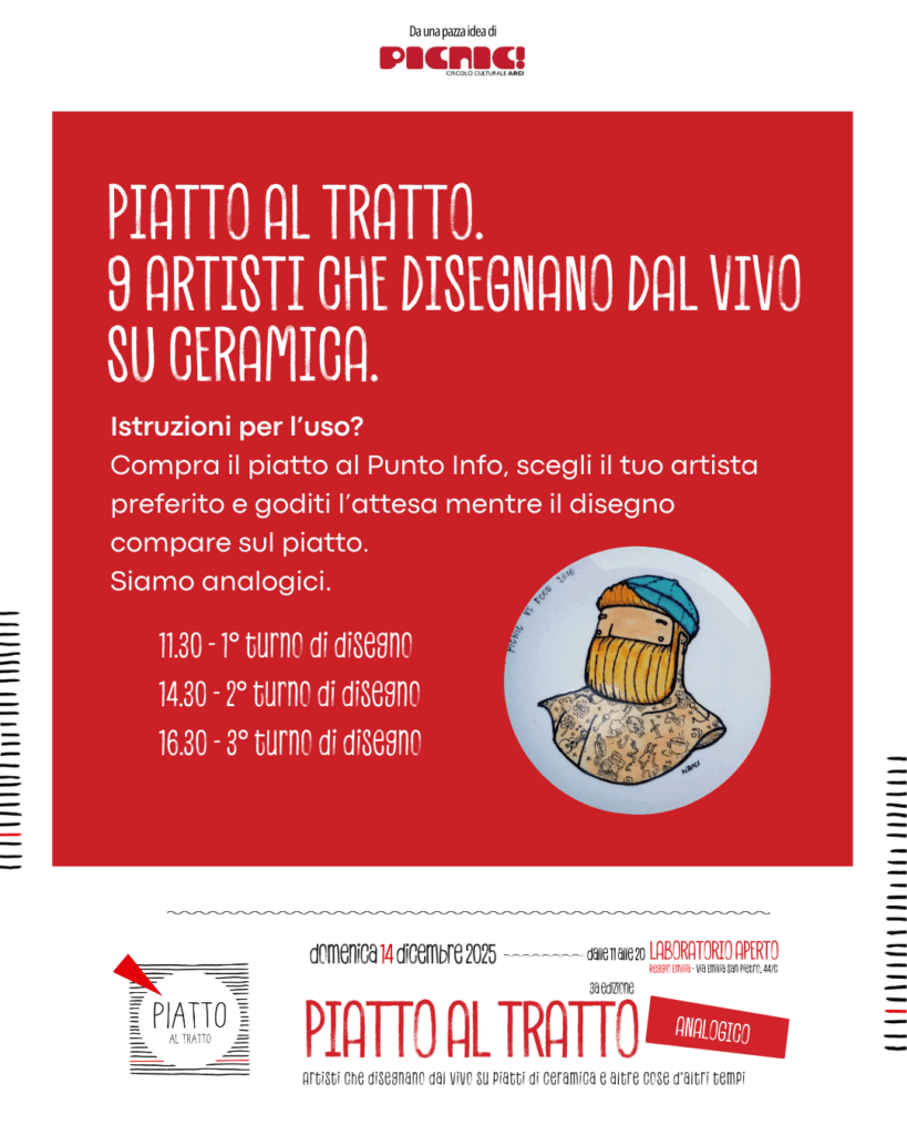 Illustratori e fumettisti disegnano dal vivo su piatti di ceramica producendo opere d’arte uniche su richiesta del pubblico. L’evento prevede – oltre al tavolo degli artisti – anche la libreria Apristorie con vendita di libri e fumetti, laboratori per diverse fasce di età ed un dj set di Daniele Carrettti (OFFLAGADISCOPAX) .